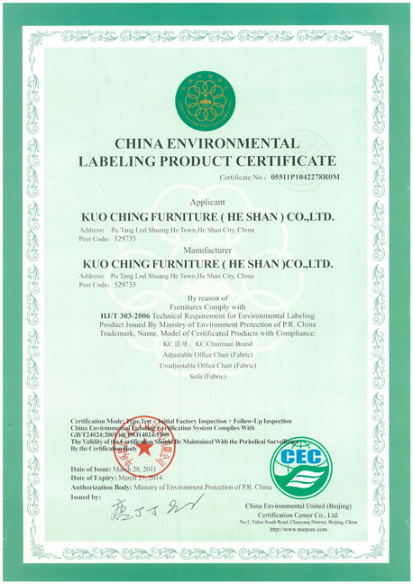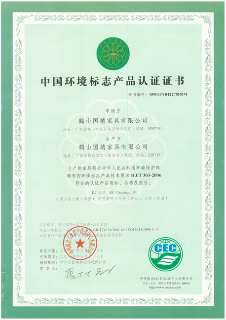 經過中環聯合(北京)認證中心的重重審核,鶴山國靖家具有限公司順利通過環境標誌產品認證。